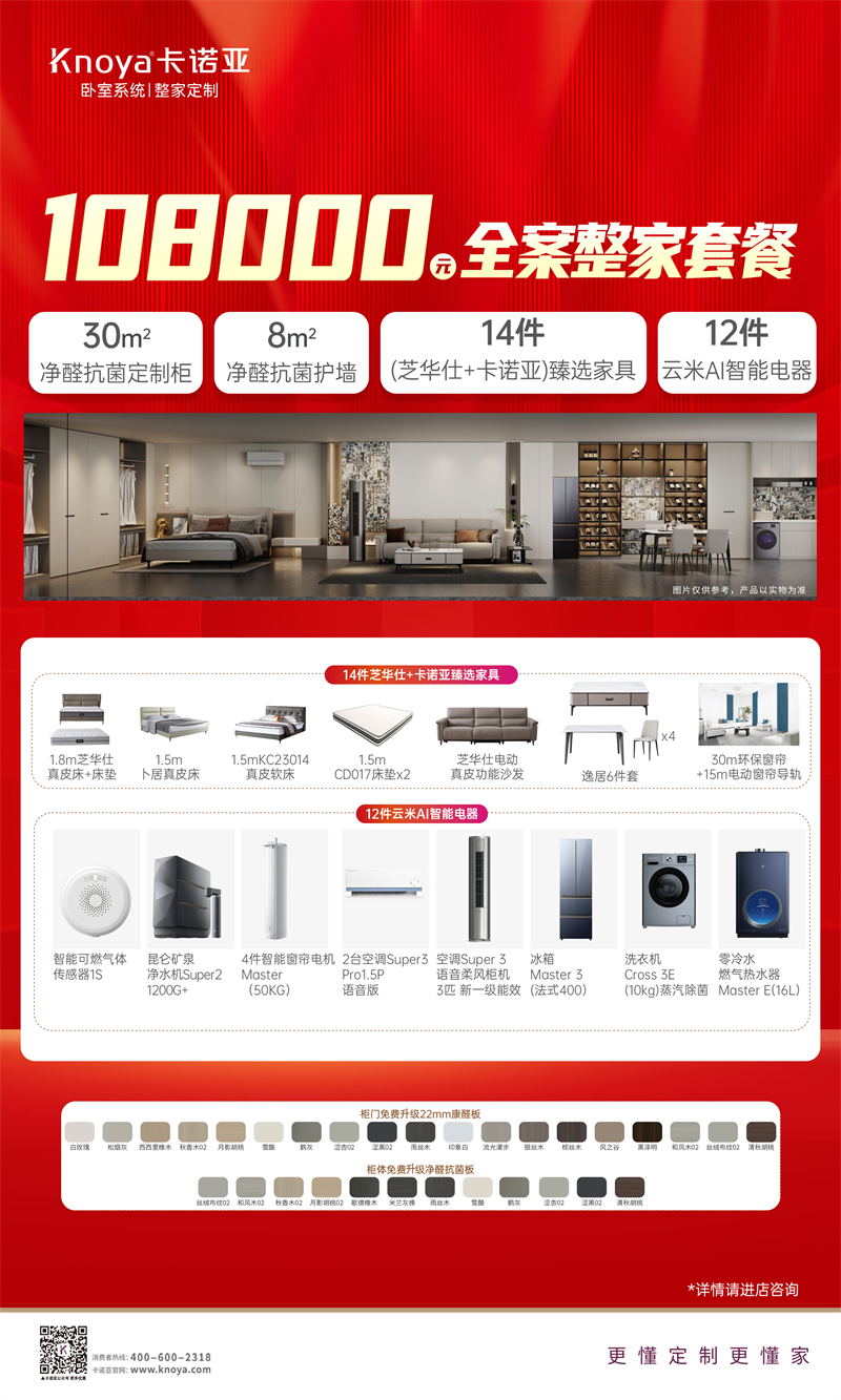 品質(zhì)生活,從臥室開始。本次活動(dòng),卡諾亞攜手芝華仕、CBD、云米科技等多個(gè)知名品牌,傾情推出32800元忙在臥室套餐、28800元享在臥室套餐、24800元學(xué)在臥室套餐等,整合臥室系統(tǒng)定制+高端整家配套,包含定制柜、護(hù)墻板、家具家品及智能家電,一站式打造舒適睡眠、智能便捷、格調(diào)美學(xué)、高效收納兼?zhèn)涞钠焚|(zhì)休憩空間。