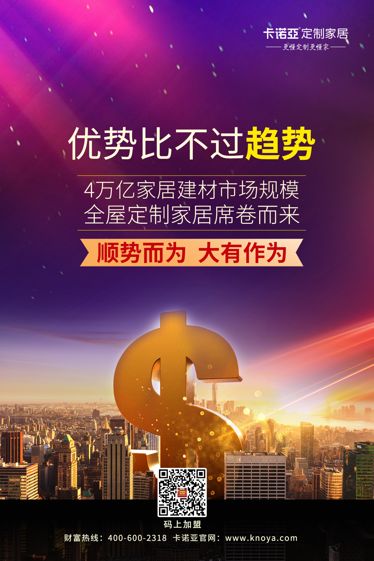 跟上時(shí)代趨勢(shì),對(duì)創(chuàng)業(yè)者而言就是“選對(duì)一個(gè)行業(yè),成就一種高度”;發(fā)揮個(gè)人優(yōu)勢(shì),就是眾所周知的“選對(duì)一個(gè)品牌,成就一生事業(yè)”。7月8-11日到廣州建博會(huì)卡諾亞展位A區(qū)4.2-20,選更懂定制更賺錢的“卡諾亞”, 趨勢(shì)+優(yōu)勢(shì)兼得,看大牌、做大商,就等你來。